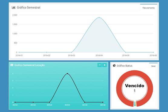 Muitos gráficos para facilitar a analise de cada parte de sua gestão, quantidade de caçamba locadas, para retirar e disponíveis.